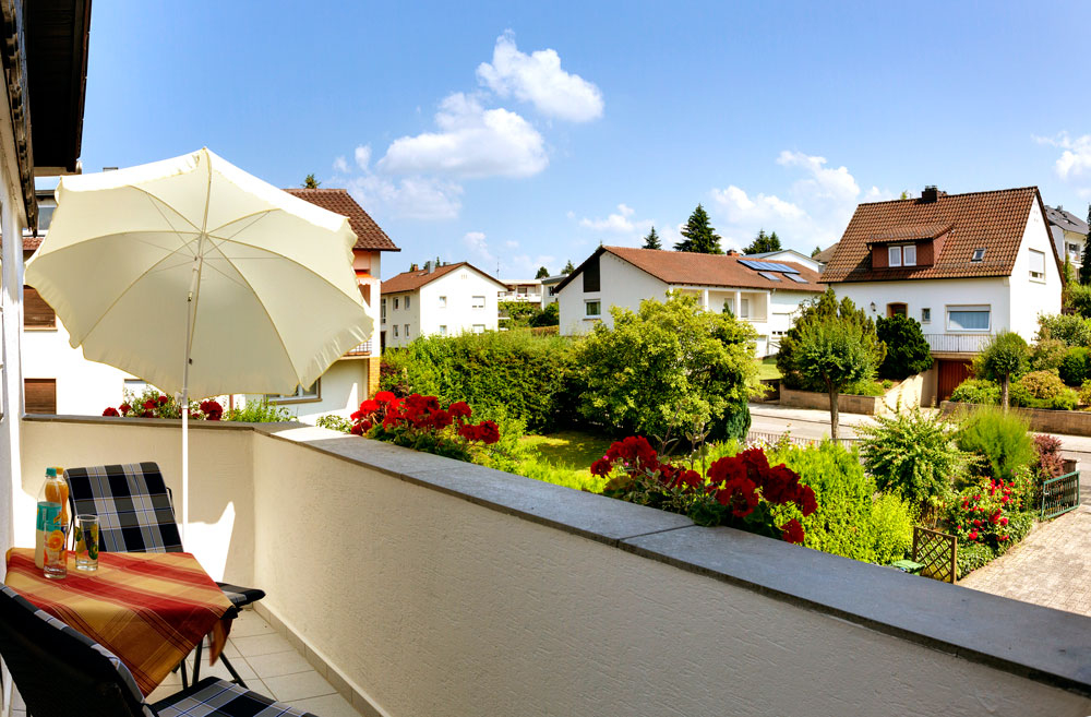 - ein Balkon mit Sonnenschirm, Tisch und 2 Stühle